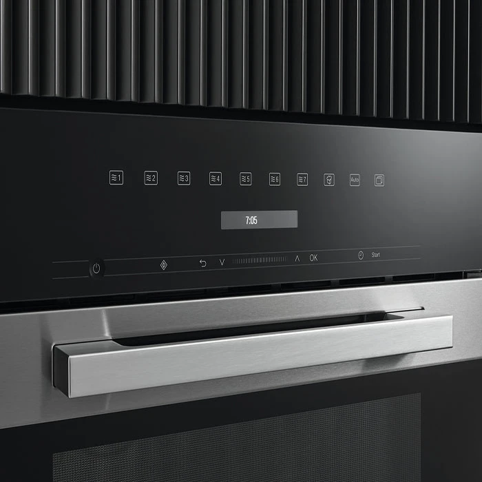 Horno microondas empotrable. Diseño en acero inoxidable muy combinable y manejo en la parte superior.